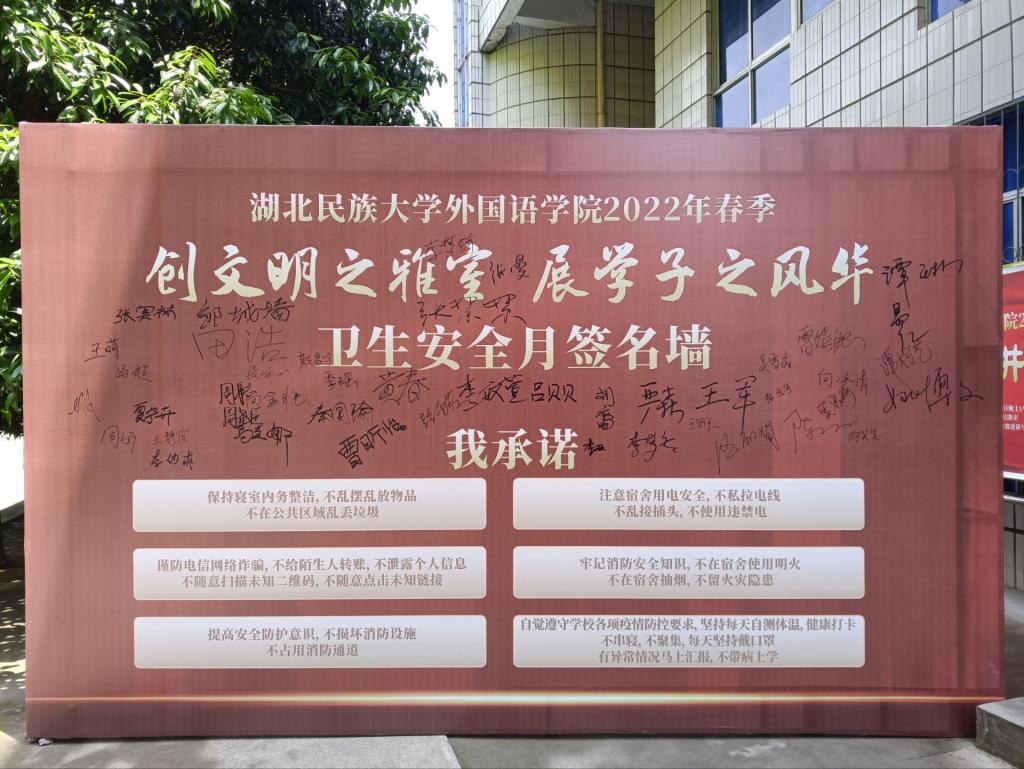 时间:2022-04-19 编辑:曾小玉 点击:本网讯(通讯员 周海艳) 为了切实做好寝室卫生安全工作,落实“六防”安全教育,4月18日,外国语学院于文汇楼前开展以“创文明之雅室,展学子之风华”为主题的第二期公寓卫生安全月活动。外国语学院党组织书记严森、外国语学院学生科科长粟登平、外国语学院各班主任以及各班学生代表参加本次活动。