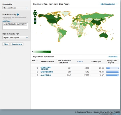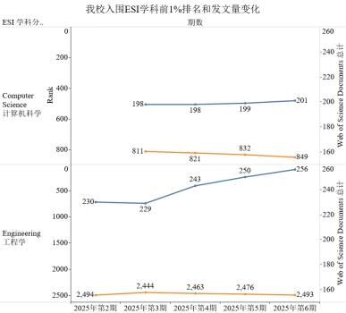 根据基本科学指标数据库(Essential Science Indicators,简称ESI)2025年11月13发布的最新数据显示(2025年11月13日更新,数据涵盖10年8个月:2015年- 2025年8月),本期共有10158家研究机构进入ESI全球前百分之一,我校共有2个ESI学科进入全球前1%,如图1和图2所示分别是Engineering工程学和Computer Science计算机科学。
