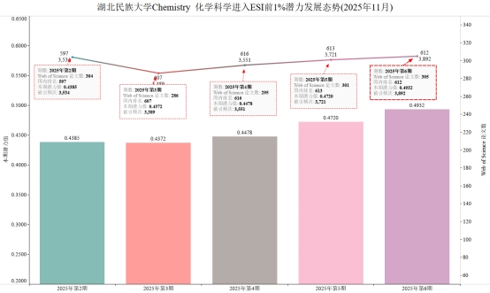 本期我校有望进入ESI前1%的学科Chemistry化学学科,潜力值为0.4932,论文数305,引用量3892,本期入围阈值7891。