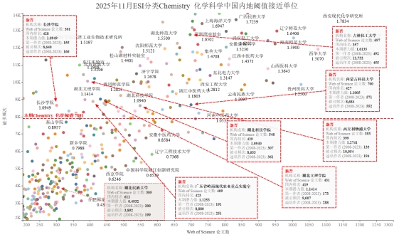 本期Chemistry化学学科国内新晋入围ESI前1%的高校和全球排名为:吉林化工大学(1720)、西交利物浦大学(2104)、湖北文理学院(2130)、广东省岭南现代农业重点实验室(2143)、长沙学院(2150)、内蒙古科技大学(2165)和 湖北科技学院(2171)。