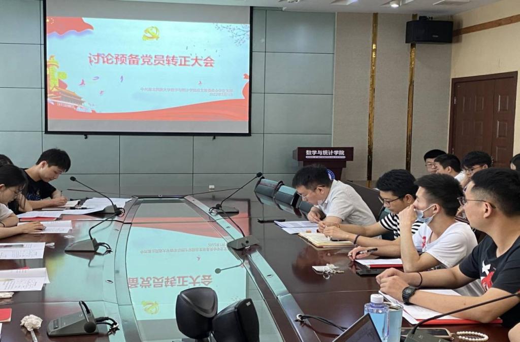 2022年7月1日下午,数学与统计学院学生党支部在四楼会议室召开支部大会,讨论确定刘悦、王子昂、付慧等6名预备党员为正式党员。全体党员参加此次支部大会。会议由党支部书记黄丽娜同志主持。