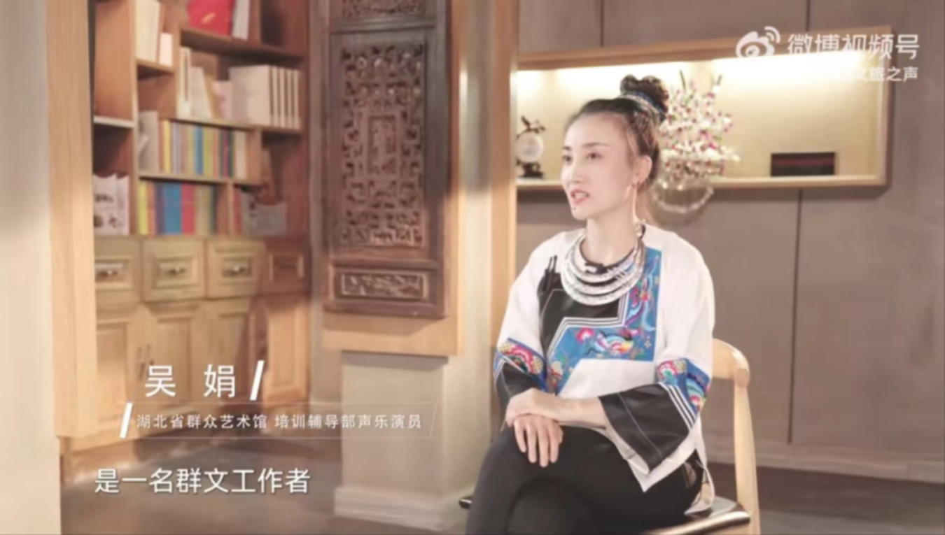 吴娟是湖北省群众艺术馆(湖北省非物质文化遗产保护中心)的一名声乐演员,自幼跟随父辈全面系统地学习传统苗族音乐,从事传统音乐传承工作二十余年。她将苗歌演唱技法与时代相结合,碰撞、融合、升华,逐渐形成了具有鲜明苗族特色的原声民族唱法。