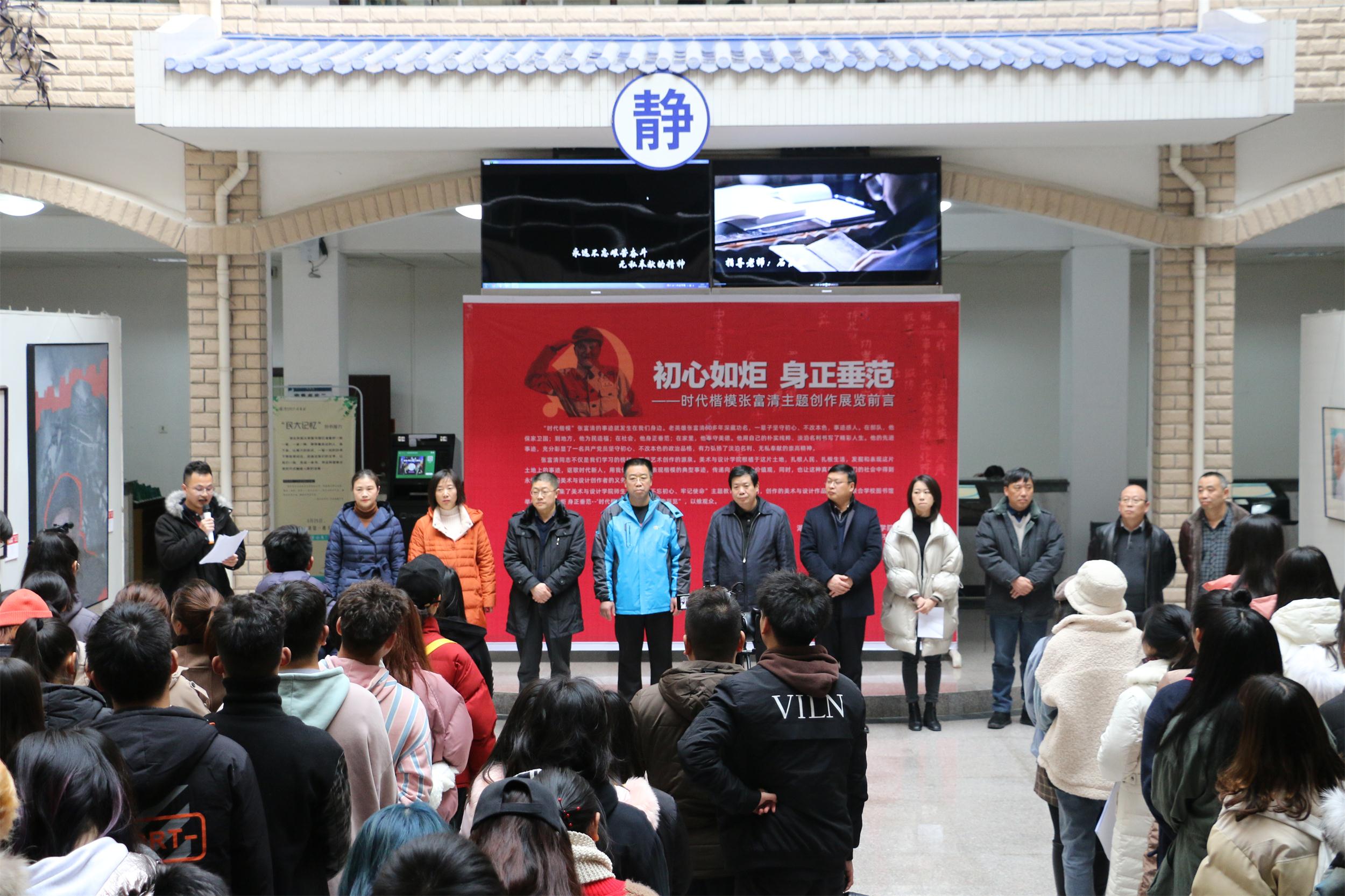 (本网讯)12月30日,由美术与设计学院、图书馆联合举办的“初心如炬 身正垂范——‘时代楷模’张富清主题创作展览”,在图书馆一楼展区正式开幕。学校党委副书记汪兴平,党委宣传部常务副部长唐敦双,教务处处长谭世明,学生工作部部长向政,图书馆党总支书记胡源、馆长罗世家、副馆长李远明,美术与设计学院院长金晖、副院长石庆秘,张富清老英雄的孙女张然应邀出席开幕仪式。仪式由美术与设计学院党总支书记田英主持。