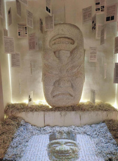 作品简介::恩施傩面具又叫“脸壳”或“脸子”,是傩戏演出时表演艺人们所佩戴的一种道具。该作品由恩施傩面具一"阴阳太”,傩面具研究文献资料及影像构成。将傩面具文字概念化、图片概念化,用重新解构重组的方式呈现出来,再结合新媒体技术,将两者相融合,体现对恩施傩面具保护和传承的思考。