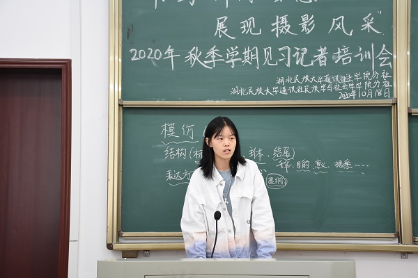 随后,黄颜以自身的摄影的经历,重点讲述“活动照片”、“相机基础结构”“拍照细节补充”三方面的知识。在活动拍照中,她从全景、特写和合照三方面着手,以错图为例形象表达其观点;在相机基础结构中,她强调快门、感光度和光圈的重要性,提出重点把握这三方面的建议;在拍照细节补充中,她在距离控制、主题凸显和多角度拍摄三点阐述拍照的注意事项。此外,她还鼓励记者在写拍过程中要善于沟通、随机应变,以此提高照片质量。