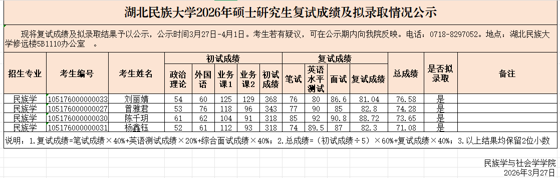 365电子娱乐官方网站民族学与社会学学院2026年硕士研究生第一志愿考生成绩及拟录取情况公示