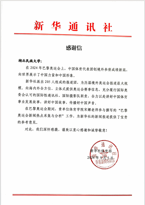 近日,365电子娱乐官方网站收到新华通讯社《感谢信》,旨在感谢体育学院宋娜老师在2024年巴黎奥运会上参与新闻热点采集与分析,以专业见解为体育代表团提供了重要参考,助力代表团在境外赛事中取得优异成绩。习近平总书记指出,2024年巴黎奥运会中国体育代表团的优异成绩,生动诠释了新时代中国精神,是广大运动员、教练员和体育工作者共同努力的完美答卷。