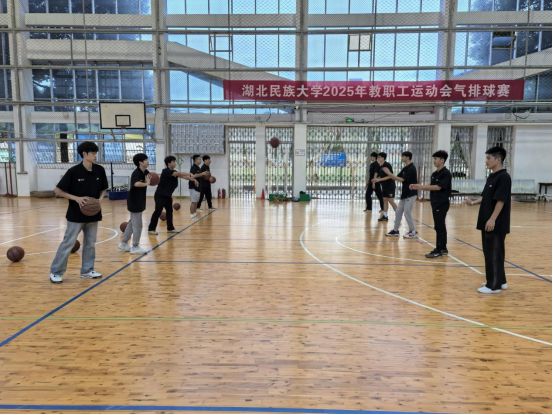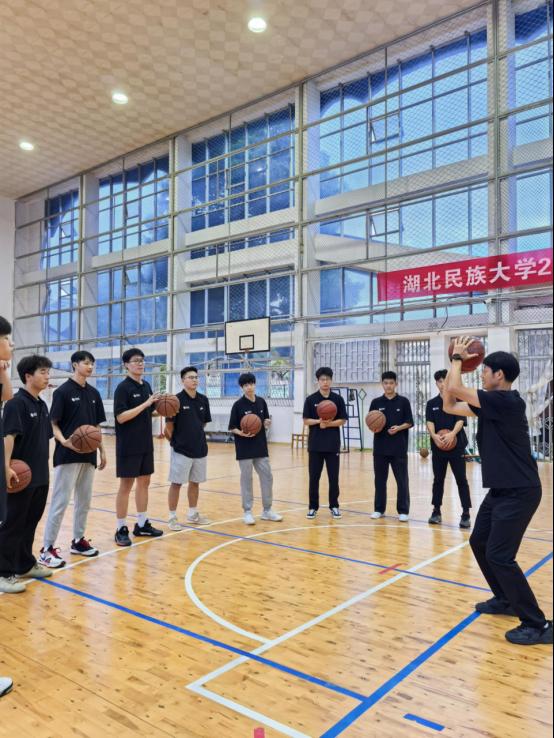 在出征仪式开始前,体育学院党总支副书记万利为全体志愿者组织了岗前培训会。会上,万利副书记勉励大家要深刻理解并践行姚基金的公益理念,弘扬“奉献、友爱、互助、进步”的志愿者精神,将所学专业知识转化为服务乡村教育的实践能力。此次培训之前,万利副书记与教练员宋庆龙、韩表表老师还组织志愿者们进行了教学技能展示。志愿者们动作规范、技术扎实,配合默契,凭借出色的篮球技艺和饱满的精神状态,展现出湖北民大学子过硬的专业素养与昂扬向上的青春风采,也为即将开展的支教工作奠定了坚实基础。