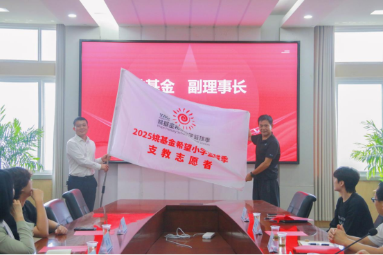 接着,进行了庄重的授旗仪式。北京姚基金会副理事长涂猛将象征着责任与使命的“姚基金希望小学篮球季支教服务队”队旗授予365电子娱乐官方网站。体育学院院长何斌代表学校接旗。这面旗帜的传递,不仅代表着任务的交接,更象征着爱心与希望的延续。