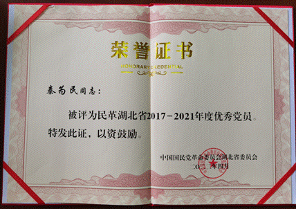 4月21日至23日,中国国民党革命委员会湖北省第十五次代表大会在武昌召开,会议授予38个单位“民革湖北省2017-2021年度先进集体”,116位同志“民革湖北省2017-2021年度优秀党员”荣誉称号。我校民革支部委员秦为民被评为“民革湖北省2017-2021年度优秀党员”。