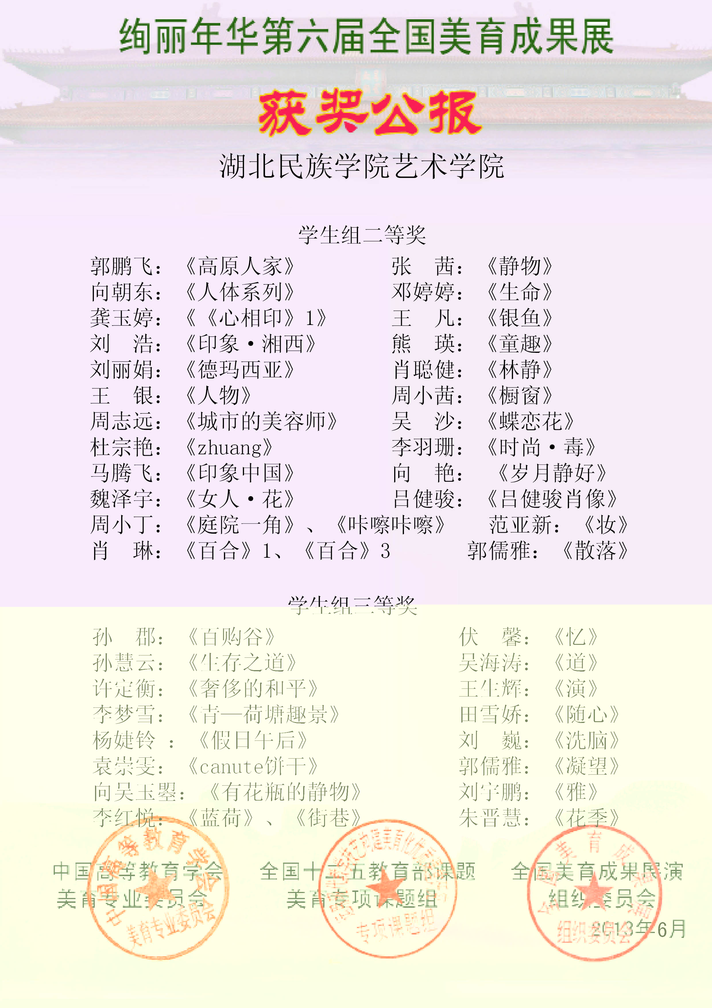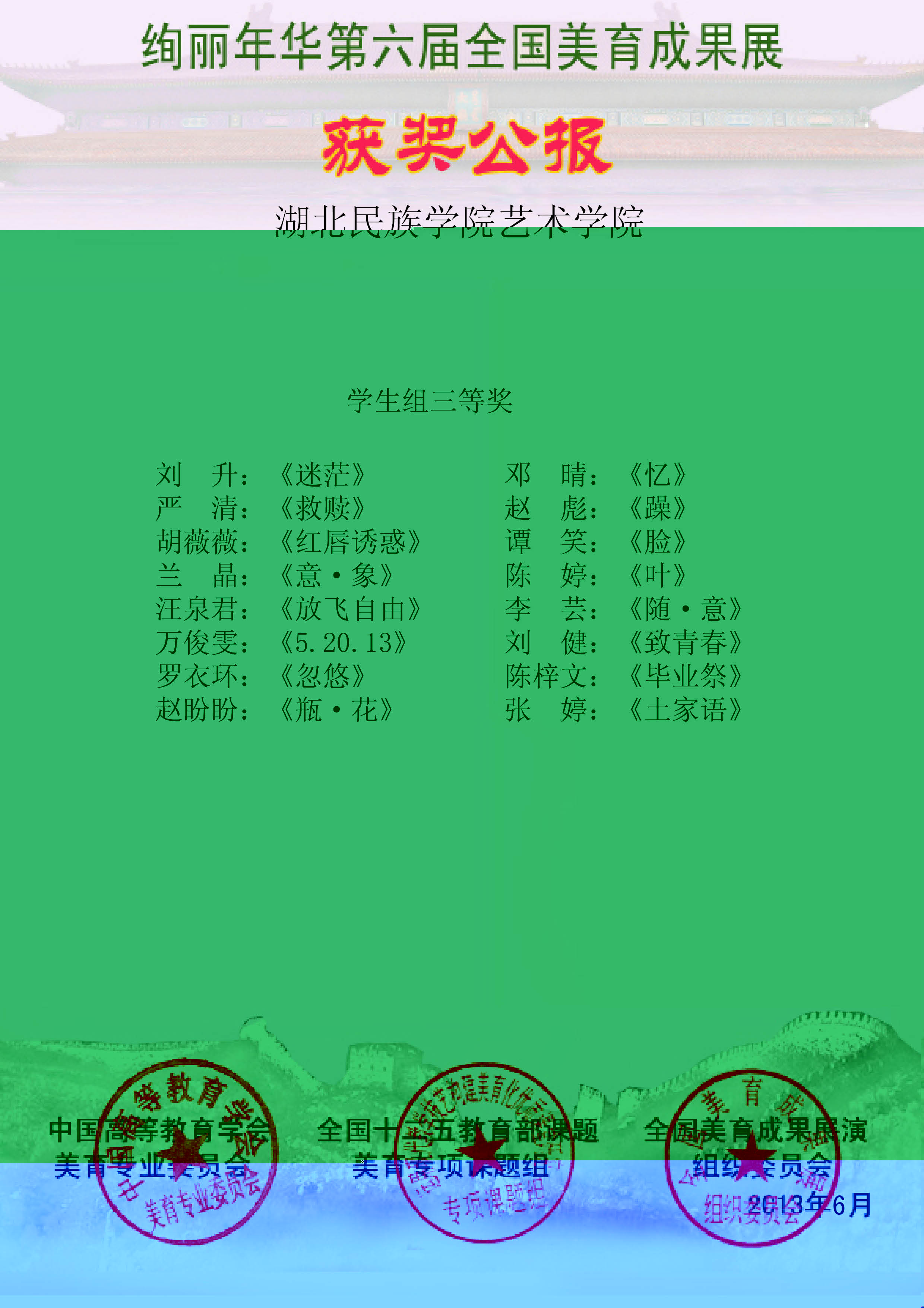 艺术学院学生在中国高等教育学会美育专业委员会组织的第六届全国美誉成果展中获多项奖项。
