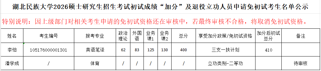 365电子娱乐官方网站2026硕士研究生招生考试初试成绩“加分”及退役立功人员申请免初试考生名单公示