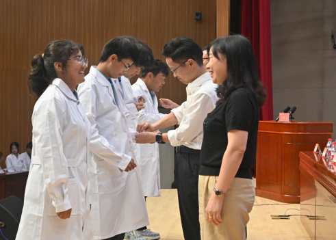 各个专业负责人为新生代表正衣冠,象征从此肩负起医者的职责与荣光,随后举行医学生宣誓仪式。