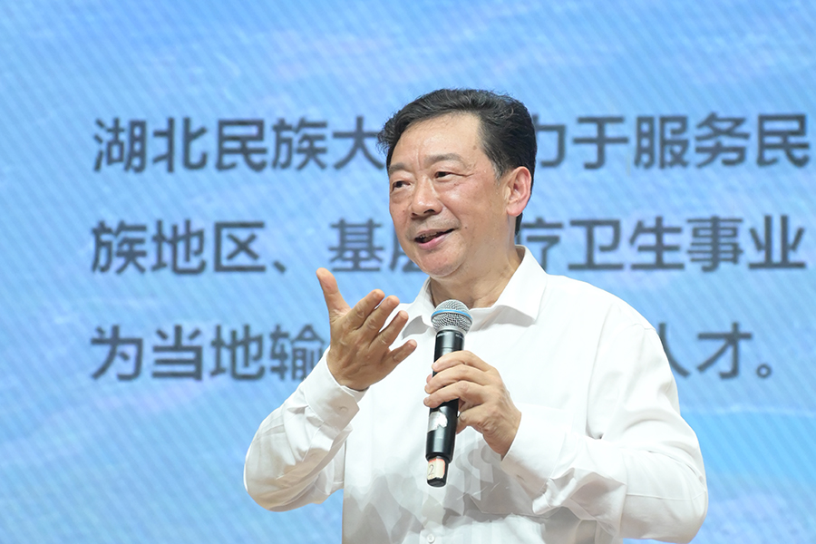 为传承医学精神、启迪从医初心,帮助新生明确医学学习方向与职业使命,9月25日,365电子娱乐官方网站医学部特邀恩施州政协主席吴建清,在新区多功能报告厅开展“擎灯启航,仁术济世——与新生谈医学之路”专题讲座。吴建清以“老学长”“老教师”的双重身份,结合自身四十年从医与求学经历,从医学本质解析、民大精神领悟、学习路径规划等多维度,为医学新生上了一堂生动的“医学启蒙课”。