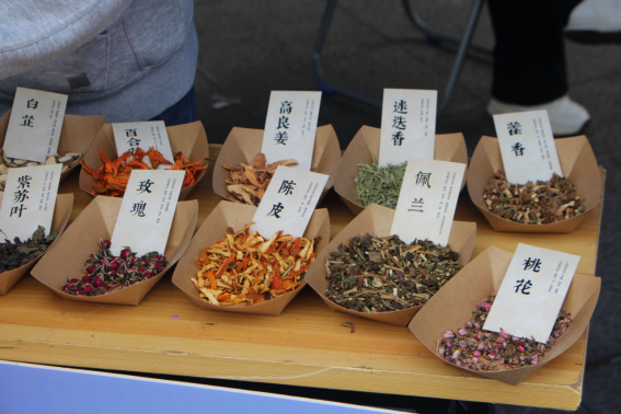 对此,工作人员均热情耐心解答,不仅详细介绍各种药材的传统药性、气味特点,更依据中医“君臣佐使”的配伍理念,为同学们提供科学的组合建议。例如讲解如何搭配某些香料以达到“理气醒神”的效果,帮助缓解疲劳、提升专注。