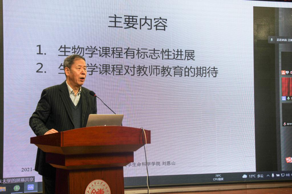 谢凯彬教授主持研讨会,首先由刘恩山教授关于“我国生物学课程改革的热点与趋势”的专题报告拉开序幕,随后湖南师范大学的戴国博士、南京师范大学的赵芳芳博士、郭舒晨博士、东北师范大学的靳冬雪博士分别以“以跨学科概念为主题的高中校本课程的设计与实施”、“Middle School Students’Alternative Conceptions about the Human Blood Circulatory System Using Four-ticr Multiple-choice Tests”、“ 生物教学中科学模型的意义建构”、“基于Rasch模型与因素分析的学生科学态度评价工具开发研究”等报告和现场专家、生物科学专业的师生及线上的师生进行了深入地交流。