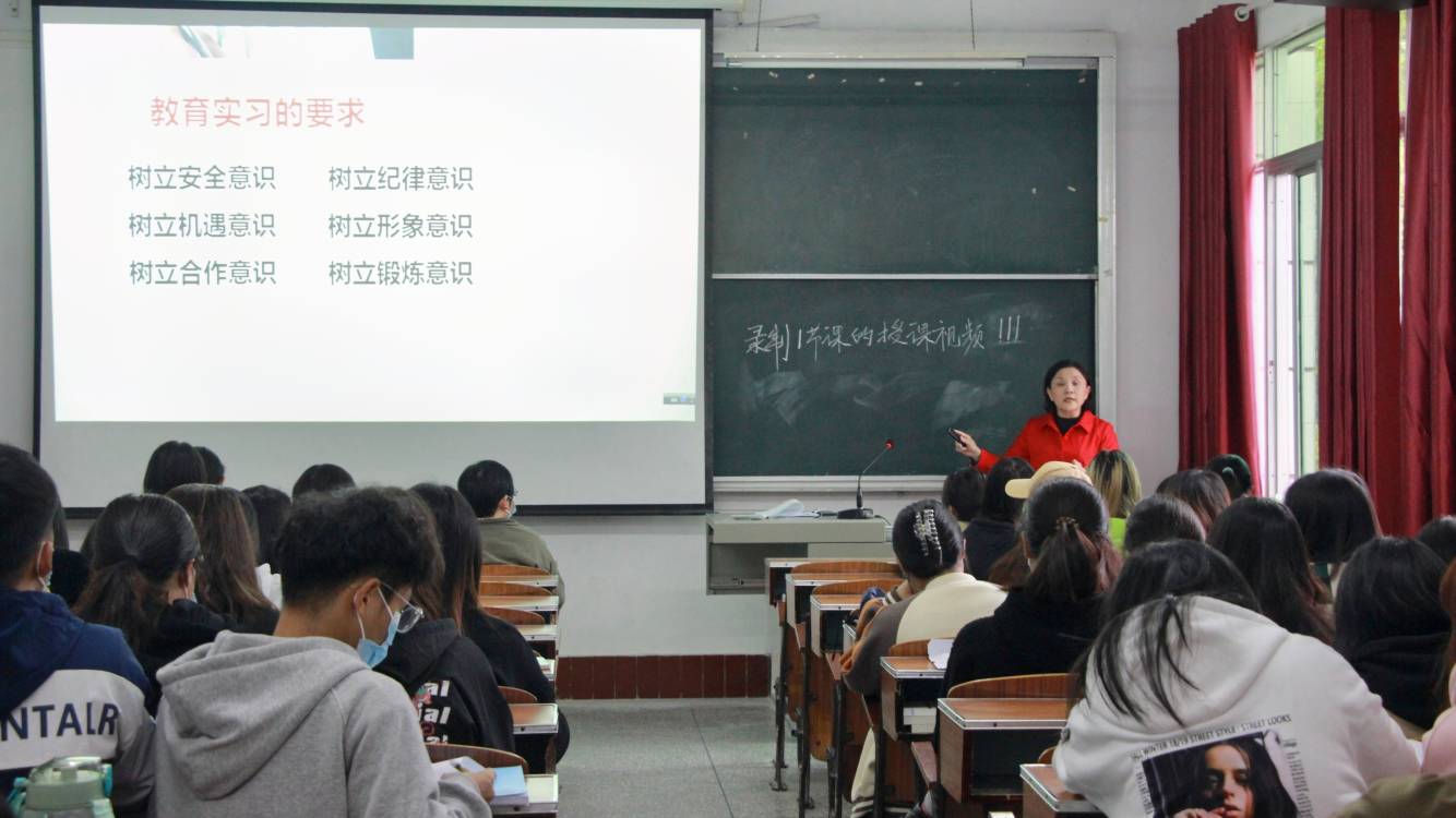 本网讯(通讯员 汪瑞 朱小娟/文 通讯员 王元/图)教育实习是师范生培养的重要组成部分,属于教育实践课程,通过教育实践可以树立从事教育工作者的坚定理想信念,增强从事教育工作的光荣感和责任感。为帮助学生熟悉教学工作,增强教师情怀,掌握相应教学策略,10月7日下午,我院于4301教室举行2022年教育实习动员大会,副院长周毅峰,副书记彭璟,教学科卢婵,生物科学系系主任武芸,教师范智权以及2019级生物科学专业全体学生参加本次大会,会议由生物科学系系主任武芸主持召开。
