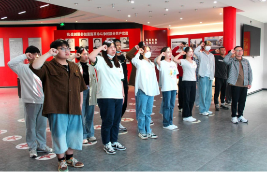 全体党员在讲解员的带领下,集中参观了鄂西特委旧址和纪念馆,一同回顾了抗战时期中共鄂西特委建立历程和开展革命斗争的光荣历史。看到何功伟毅然决然走上百步梯,不回头地走向敌人的刑场;刘惠馨与尚未满岁的女儿诀别,慷慨赴死等动人场景,大家深受震撼,在一张张历史照片和鲜活事例中接受了深刻的党性洗礼。在参观尾声,本科生党支部书记陈杰带领全体党员在党旗面前庄严宣誓,在重温入党誓词中坚定个人政治信仰。