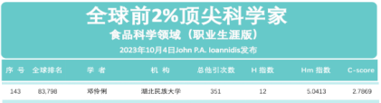 本网讯 2023年10月4日,由斯坦福大学John P.A.Ioannidis教授团队发布的《全球前2%顶尖科学家》榜单更新了2023年版本,这也是该团队公布的第六个版本。2023年10月11日,公众号《科学私享》分享了“祝贺!308名国内食品专家上榜2022《全球2%顶尖科学家》”,该榜单主要是2022单年版,我院食品科学与工程专业教师邓伶俐副教授入选全球前2%顶尖科学家食品科学领域排行榜(国内排名143位)。