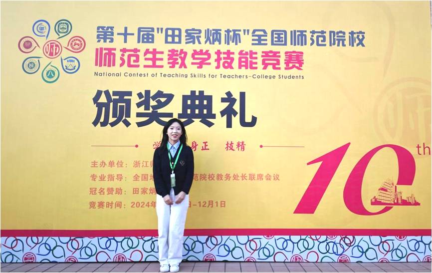 (本网讯)2024年12月1号,第十届“田家炳杯”全国师范院校师范教学技能竞赛在浙江师范大学圆满落幕。经过激烈角逐,我院夏欣同学入围决赛,并在比赛中表现出色,获得全国二等奖的好成绩。