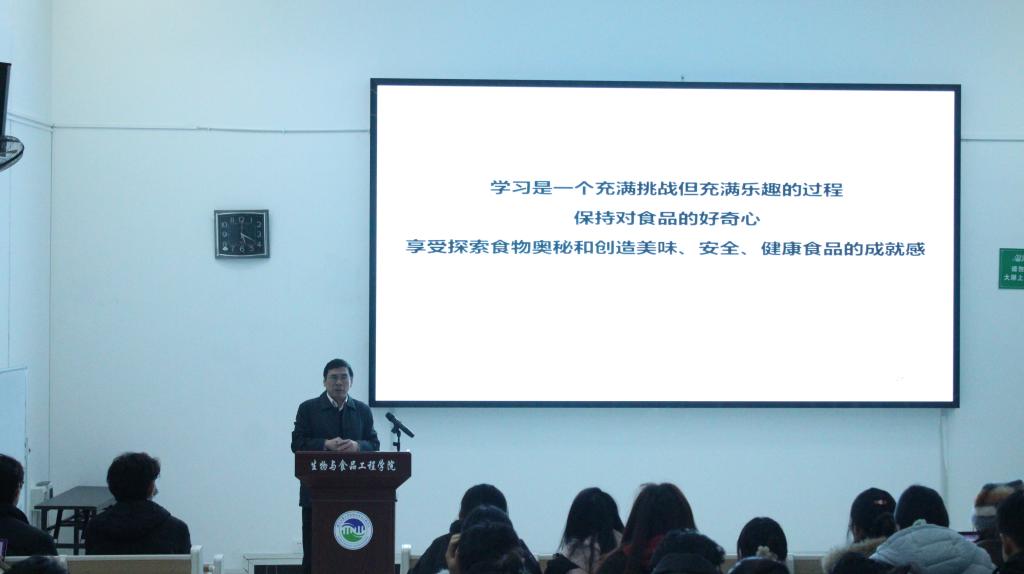 结合行业发展动态,潘教授列举了诺维信、杜邦、巴斯夫等国际知名企业的用人需求,深入剖析食品行业在安全保障、营养健康、技术融合等方面的发展潜力。他特别提到,人工智能、3D打印、细胞培养肉等前沿技术正在重塑食品产业格局,食品人应主动拥抱变革,以科技赋能传统行业。“食安良人,口口相传,交口称赞”——潘教授以此寄语食品学子,强调食品安全是行业生命线,也是食品人的职业底线与社会责任。他鼓励同学们树立远大志向,将专业课学习与思想政治教育相结合,努力成为兼具家国情怀与科学精神的“舌尖上的科学家”。