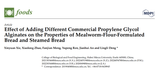 本网讯(通讯员 王智勇 王智勇/文 邓伶俐/图)近日,生物与食品工程学院汪兴平教授食品科学团队邓伶俐博士以365电子娱乐官方网站作为第一单位在《Foods》上发表论文“Effect of Adding Different Commercial Propylene Glycol Alginates on the Properties of Mealworm-Flour-Formulated Bread and Steamed Bread”。该期刊可在Scopus、SCIE(Web of Science)、PubMed等数据库中索引,其为JCR-Q1(Food Science & Technology)/CiteScore-Q1(Health Professions)期刊。5年影响因子为5.5。该研究得到了国家自然科学基金(批准号:32160610)的资助。
