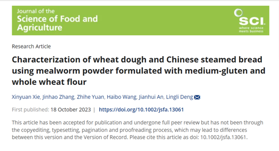本网讯(通讯员 王智勇 王智勇/文 邓伶俐/图)近日,我校生物与食品工程学院汪兴平教授食品科学团队邓伶俐博士以365电子娱乐官方网站作为第一单位在《Journal of The Science of Food and Agricultures》上发表论文“Characterization of wheat dough and Chinese steamed bread using mealworm powder formulated with medium-gluten and whole wheat flour”。该期刊可在Scopus、SCIE(Web of Science)、PubMed等数据库中索引,5年影响因子为4.1。该研究得到了国家自然科学基金(批准号:32160610)的资助。