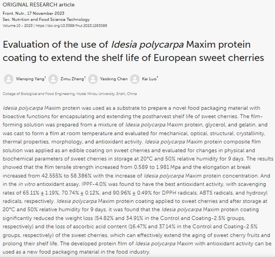 本网讯(通讯员 王智勇 王智勇/文 罗凯/图) 生物与食品工程学院副教授罗凯博士以365电子娱乐官方网站为第一单位在国际食品权威学术期刊Frontiers in Nutrition(中科院二区,五年影响因子5.7)上发表题为“Evaluation of the use of Idesia polycarpa Maxim protein coating to extend the shelf life of European sweet cherries”的最新研究成果。论文第一作者系我校食品科学与工程2021级研究生杨文清同学。