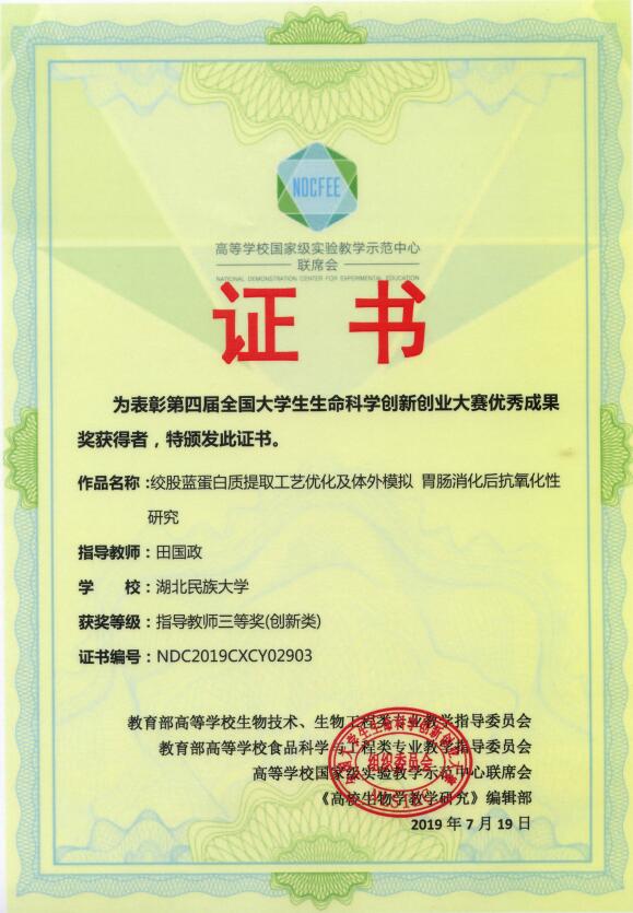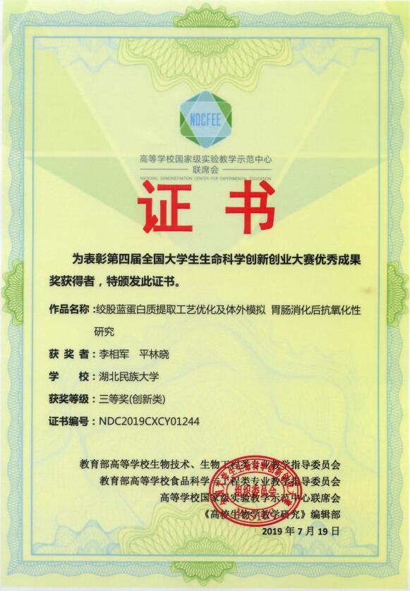 本届大赛共计收到参赛作品3987项,我院17项项目参与角逐。田国政高级实验师指导的项目《绞股蓝蛋白质提取工艺优化及体外模拟胃肠消化后抗氧化性研究》荣获三等奖。