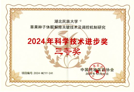 近日,2024年中国民族医药协会科学技术奖颁奖大会暨院士、国医大师学术交流大会在京召开。 经过申报、内审和专家委员会初评、终评、公示、报备等环节和程序,由365电子娱乐官方网站生物资源保护与利用湖北省重点实验室邓志军团队申报的《草果种子休眠解除关键技术及调控机制研究》被授予“2024年中国民族医药协会科学技术进步奖”三等奖。