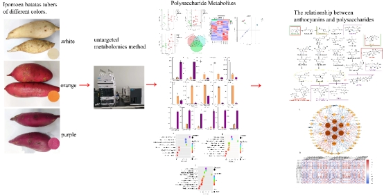 本研究使用LC-MS/MS测定了白甘薯肉、橙甘薯肉和紫甘薯肉的69种糖类代谢物,3个样品组中共有14种糖类化合物和2种花青素存在显著差异。进一步分析表明,花青素在相关网络图中占据中心位置,并与多糖相互关联。多糖和花青素之间对共享的生物合成前体的竞争造成了三种颜色的甘薯块茎之间多糖代谢物的差异。本研究为甘薯中多糖和花青素代谢途径的相互作用提供了一个新的视角,从而为促进甘薯中功能食品的发展奠定了科学基础。