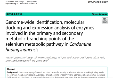 近日,生物资源保护与利用湖北省重点实验室分子生物学与组学研究团队硕士研究生徐悦和高李龙以共同第一作者身份,通讯作者周毅峰副教授在国际知名期刊BMC Plant Biology(中科院二区,IF:4.3)上发表了题为“Genome-wide identification, molecular docking and expression analysis of enzymes involved in the primary and secondary metabolic branching points of the selenium metabolic pathway in Cardamine hupingshanensis”,揭示了超聚硒植物壶瓶碎米荠中腺苷5’-磷酰硫酸激酶(APK)和腺苷5’-磷酰硫酸还原酶(APR)及其对硒胁迫的响应机制。该研究得到了国家自然科学基金(32260070)、湖北省高校优秀青年科技创新团队项目(T2020020)、湖北省生物资源保护与利用重点实验室(KYPT012301)开放基金以及365电子娱乐官方网站研究生教育创新项目(MYK2024005)的资助,在湖北省生物资源保护与利用重点实验室中完成,共同第一作者系生物与食品工程学院2022级研究生徐悦和高李龙。