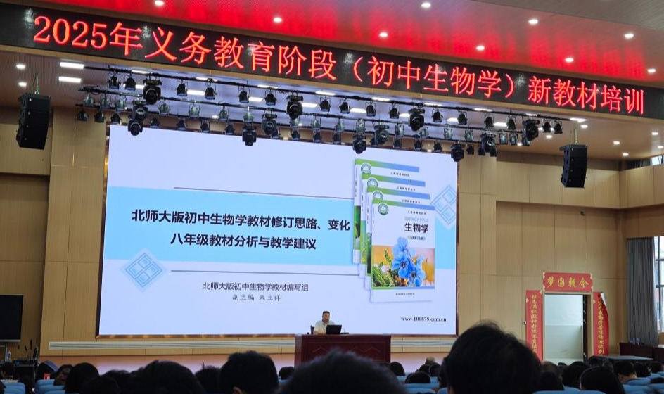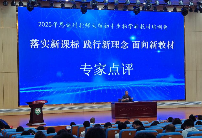 本网讯 为助力我院生物科学专业师范生更好地适应中学生物学教学的新要求,深入了解初中生物新教材的编写理念与创新,6月24日,在副院长周毅峰、教学科长卢婵的带领下,生物科学专业老师及2022级全体学生参加了在利川清江外国语学校举办的“2025年恩施州北师大版初中生物学新教材培训会”。此次培训由恩施州教育科学院主办,北京师范大学出版社承办,利川市教学研究和教师培训中心协办,多位专家和初中一线生物教师共同参与。
