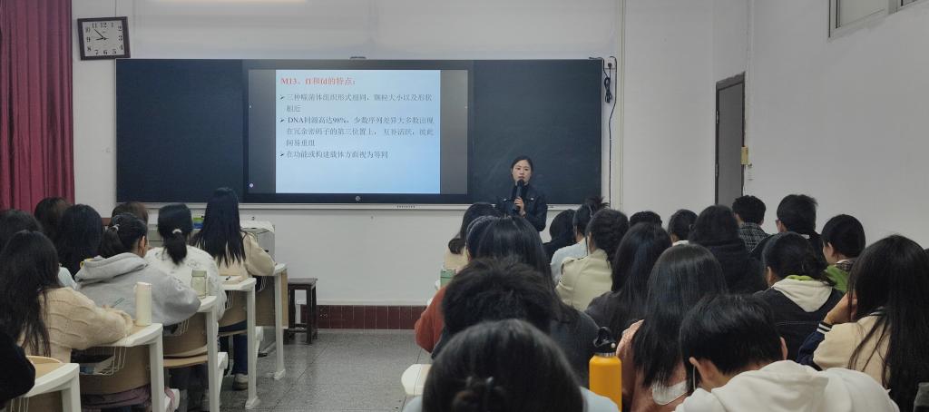 首先,罗颖老师进行了《基因工程》单链丝状噬菌体载体章节的公开课教学。罗颖老师授课课堂氛围轻松有趣、互动性强,能启发学生思考,引导学生自己探索知识。对课堂的把控合理,富有感染力。