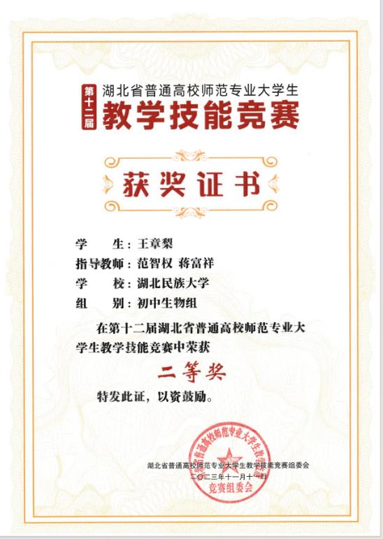 (本网讯)11月11日,第十二届湖北省普通高等学校师范专业大学生教学技能竞赛决赛在华中师范大学圆满落幕。本次比赛共有来自湖北省16所高校共215名各专业学生参加初赛,其中来自13所高校共64名学生进入决赛。经过激烈角逐,我院王章梨同学在比赛中表现出色,荣获初中生物组二等奖。