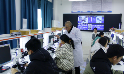 随后,在操作实践环节,学生们跃跃欲试,眼睛紧盯目镜,双手小心调试焦距旋一钮。此时老师也在台下用春风化雨的方式指导成像不清的同学捕捉清晰画面。从一步步的显微操作成像到亲眼目睹洋葱根尖细胞的不同形态,惊喜又好奇,微观世界的神奇让大家沉醉其中、流连忘返。大家相互交流着自己的观察发现,现场气氛热烈非凡。