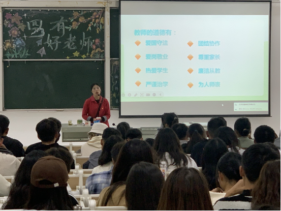 随后,向素桃从两个方面就怎样成为一名好老师进行讲授。她表示,教师要有崇高的职业道德,作为一名老师要有理想信念、道德情操、扎实学识与仁爱之心,教师要肩负教书育人的责任,要有强烈的使命感。教师不仅要有过硬的个人素养,更要有好的政治素养和业务素养。我们要树立终身学习的理念,在教中学,在学中教。要不断地研究与创新,更要不断地反思自己。提高自己的沟通协调能力,保持积极向上的心态。最后,向素桃表示,好老师没有固定的标准,只要用心去践行教育的初心和使命,大家一定能成为一个优秀的人民教师!