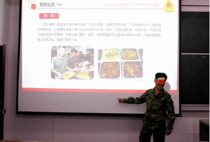 本次活动分为三项。活动第一项,学生科副科长陈杰从部队简介、应征入伍基本条件、入伍流程、军营生活四个方面向大家介绍入伍的相关事宜,并就应征入伍男生与女生的基本条件差异做了详细说明;活动第二项,我院两位退伍大学生肖洪涛、彭万凤从不同的角度向大家展示自己丰富多彩的军旅生活,以及当兵政策和待遇。肖洪涛表示,退伍已经两年,但在部队的日子他仍然历历在目。他幽默地向大家讲述自己刚入伍生活的艰辛。他在最后说道:“当兵更多的是一种责任,一种担当”。彭万凤通过一些照片和视频向大家直观的展示部队生活,还教大家通过手腕上是否有茧来判断一个人是否有当兵经历。她激励大家道:“我相信进入部队,你会收获一帮出生入死的战友,他们甚至愿意替你挡子弹”。她认为这一身绿色的军装将是她人生中最宝贵的回忆;活动第三项,有意向入伍的同学踊跃的提出自己的疑问,陈杰和两位退伍大学生热情地解答,并就不同的情况给出相应的建议。