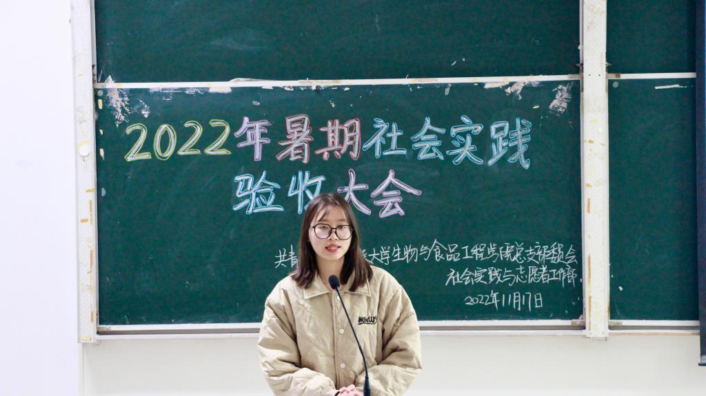大会伊始,曹子墨对暑期社会实践做出简单介绍。随后,王章梨作为优秀个人代表上台发言,她从实践方式、实践过程、实践成果、实践感想四方面向大家分享她的暑期社会实践内容。她分享了一些他们团队暑期社会实践活动中的照片与故事,她提到,这是她第一次以老师的身份去教学,虽然只有半个月,但收获很多,虽然在社会实践途中遇到许多困难,但他们也都一一克服,在不断的磨炼中收获成长。之后,原芝荷作为优秀团队代表上台发言,她介绍了他们团队在确立实践项目后所进行的一系列准备,讲述了实践中遇到的困难以及解决的方法等,并展示了他们团队在本次实践中所取得的成果。她提到,在实践过程中要具备大局观,她通过分享自己暑期社会实践的所见所闻,表达在社会实践中大家需要不惧困难、勇敢面对困难并克服困难,要锻炼在处理突发事件时的随机应变能力和沟通能力。