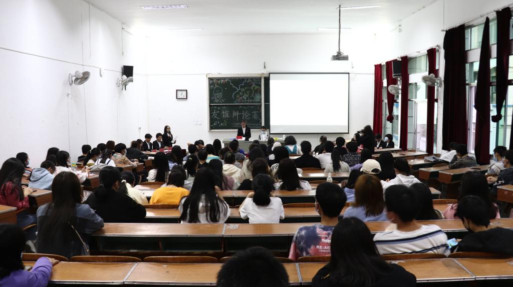 本网讯(见习通讯员 王圳垚 牟广锐/文 见习通讯员 热依拉/图)4月9日19:00,我院联合化学与环境工程学院举办的友谊辩论赛于我院4202教室拉开序幕。我院优秀辩手徐佳美、原芝荷,化学与环境工程学院优秀辩手徐明珠、朱时杰担任评委,赵冬生担任主席,近100名学生观看此次比赛。