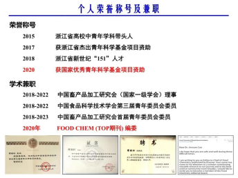 国家优秀青年科学基金获得者,Food Chemistry编委,Frontier in Microbiology、Frontier in Nutrition、Foods等杂志客座主编,《食品科学》、《未来食品科学》、《肉类研究》等杂志编委、青年编委,中国生物工程学会理事,中国畜产品加工研究会理事,全国畜牧业标准化技术委员会猪业标准化工作组委员,中国食品科学技术学会青工委委员,浙江省杰青,浙江省新世纪“151”人才,浙江省高校中青年学科带头人。