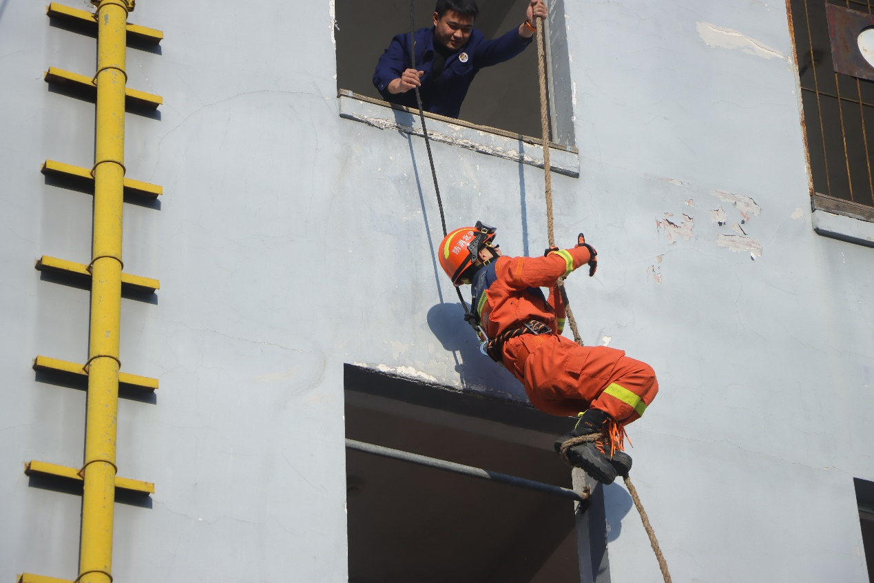 消防员演示绳索爬楼