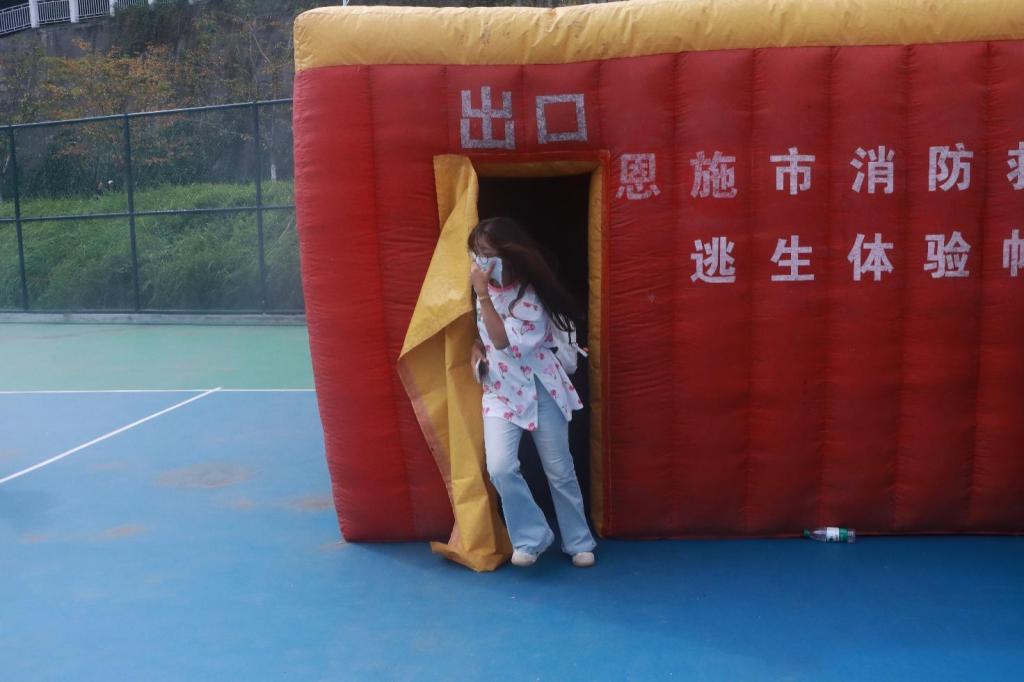 在模拟疏散帐篷体验区域,新生按照“低姿、捂口鼻、触壁前行”的规范要求,进行浓烟环境下的疏散逃生演练;同学们有序进入消防逃生帐篷,帐篷内模拟了火灾现场浓烟弥漫、光线昏暗的环境,新生们按照所学的逃生知识,用湿毛巾捂住口鼻,低姿前行,在消防员的引导下,顺利“逃生”。通过这一沉浸式体验,新生们更加直观地了解了火灾逃生的要点,增强了在火灾现场的自救能力。