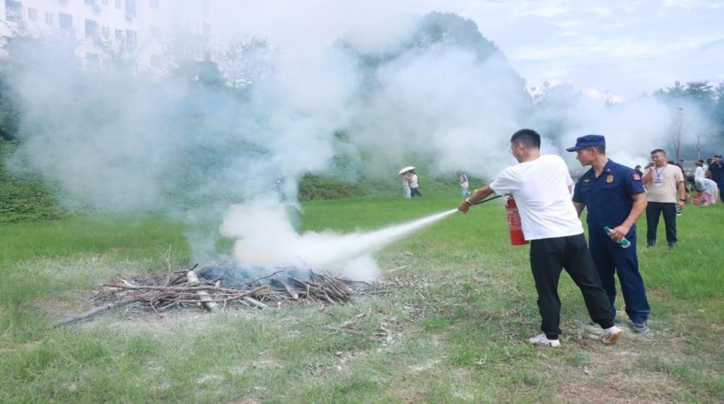 理论知识讲解完毕后,培训进入实地操作环节。在二洼篮球场后的空旷场地,消防员设置了模拟火灾点。新生们在消防员的指导下,依次上前,亲手操作灭火器。从提起灭火器,到拔掉保险销,再到对准火焰根部按下压把,每一个动作都认真对待。消防员在一旁仔细观察,及时纠正不规范的操作,确保每一位同学都能熟练掌握灭火器的使用技能,切实具备应对初期火灾的能力。