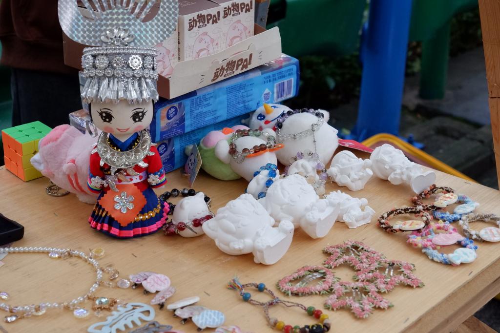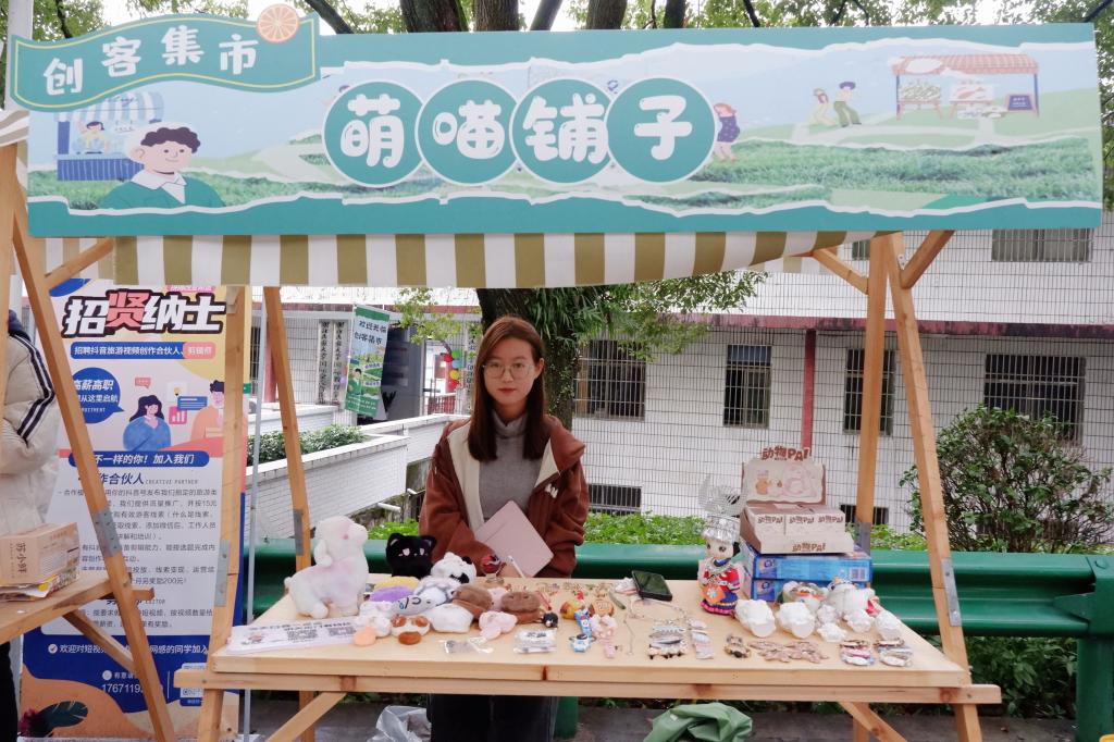 手作创意体验区同样人气高涨。这里不仅有可供DIY涂鸦的石膏娃娃、琳琅满目的彩珠供师生串制心仪的手链项链,还有柔软可爱的玩偶,以及以校园小猫为原型设计的“吧唧”和吊坠等文创产品。更惊喜的是,“小猫学长”也亲临现场,萌趣互动将氛围推向高潮。