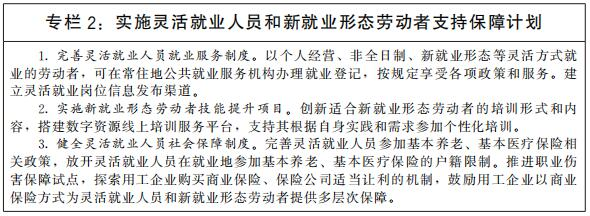 国发〔2021〕14号 各省、自治区、直辖市人民政府,国务院各部委、各直属机构: 现将《“十四五”就业促进规划》印发给你们,请认真贯彻执行。 国务院 2021年8月23日 (此件公开发布) “十四五”就业促进规划 就业是最大的民生,也是经济发展最基本的支撑。“十四五”时期,实现更加充分更高质量就业,是推动高质量发展、全面建设社会主义现代化国家的内在要求,是践行以人民为中心发展思想、扎实推进共同富裕的重要基础。本规划依据《中华人民共和国国民经济和社会发展第十四个五年规划和2035年远景目标纲要》编制,提出了“十四五”时期促进就业的指导思想、基本原则、主要目标、重点任务和保障措施,是推动就业高质量发展的工作指引。 一、发展环境 “十三五”期间,面对错综复杂的国际形势、艰巨繁重的国内改革发展稳定任务特别是新冠肺炎疫情的严重冲击,党中央、国务院始终坚持以人民为中心,将就业摆在经济社会发展优先位置,创新实施就业优先政策,推动就业工作取得积极进展。全国城镇新增就业6564万人,城镇调查失业率均值控制在5.2%,劳动年龄人口平均受教育年限从10.2年提高到10.8年,技能劳动者总量由1.3亿人增至2亿人,就业形势总体稳定,就业结构持续优化,就业质量不断提升。 “十四五”时期是我国全面建成小康社会、实现第一个百年奋斗目标之后,乘势而上开启全面建设社会主义现代化国家新征程、向第二个百年奋斗目标进军的第一个五年。当前和今后一段时期,我国发展仍然处于重要战略机遇期,党中央、国务院高度重视就业问题,实施就业优先战略,为实现更加充分更高质量就业提供了根本保证;我国已转向高质量发展阶段,以国内大循环为主体、国内国际双循环相互促进的新发展格局加快构建,经济稳中向好、长期向好,为就业长期稳定创造了良好条件;新一轮科技革命和产业变革深入发展,新兴就业创业机会日益增多;新型城镇化、乡村振兴孕育巨大发展潜力,新的就业增长点不断涌现;劳动力市场协同性增强,劳动力整体受教育程度上升,社会性流动更加顺畅,为促进就业夯实了人力资源支撑。 但也要看到,“十四五”时期就业领域也出现了许多新变化新趋势。人口结构与经济结构深度调整,劳动力供求两侧均出现较大变化,产业转型升级、技术进步对劳动者技能素质提出了更高要求,人才培养培训不适应市场需求的现象进一步加剧,“就业难”与“招工难”并存,结构性就业矛盾更加突出,将成为就业领域主要矛盾。城镇就业压力依然较大,促进高校毕业生等重点群体就业任务艰巨,在工业化、城镇化进程中,还有大量农村富余劳动力需要转移就业,规模性失业风险不容忽视。同时,就业歧视仍然存在,灵活就业人员和新就业形态劳动者权益保障亟待加强;人工智能等智能化技术加速应用,就业替代效应持续显现;国际环境日趋复杂,不稳定性不确定性明显增加,对就业的潜在冲击需警惕防范。总之,就业形势仍较严峻。必须深刻认识就业领域主要矛盾的变化,深入分析面临的挑战和风险,坚持问题导向,采取务实举措,抓住机遇,调动各种积极因素,不断开创就业工作新局面,努力实现更加充分更高质量就业。 二、总体要求 (一)指导思想。 以习近平新时代中国特色社会主义思想为指导,深入贯彻党的十九大和十九届二中、三中、四中、五中全会精神,统筹推进“五位一体”总体布局,协调推进“四个全面”战略布局,坚持稳中求进工作总基调,立足新发展阶段,完整、准确、全面贯彻新发展理念,构建新发展格局,统筹发展和安全,以实现更加充分更高质量就业为主要目标,深入实施就业优先战略,健全有利于更加充分更高质量就业的促进机制,完善政策体系、强化培训服务、注重权益保障,千方百计扩大就业容量,努力提升就业质量,着力缓解结构性就业矛盾,切实防范和有效化解规模性失业风险,不断增进民生福祉,推动全体人民共同富裕迈出坚实步伐。 (二)基本原则。 ——坚持就业导向、政策协同。继续把就业摆在经济社会发展和宏观政策优先位置,作为保障和改善民生头等大事,把稳定和扩大就业作为宏观调控的优先目标和经济运行合理区间的下限,根据就业形势变化,及时调整宏观政策取向、聚力支持就业。 ——坚持扩容提质、优化结构。兼顾容量、质量与结构,抓住主要矛盾,在多措并举创造更多高质量就业岗位的同时,更加重视日益凸显的结构性就业矛盾,聚焦劳动者技能素质提升,突出抓好技术技能人才培养培训,推动形成劳动力市场更高水平的供需动态平衡。 ——坚持市场主导、政府调控。推动有效市场和有为政府更好结合,既要坚持市场化社会化就业方向,加快破除制约就业的体制机制障碍,充分发挥市场配置劳动力资源的决定性作用,又要强化政府责任,优化整合各类资源,为促进就业提供强有力政策支持和基础性服务保障。 ——坚持聚焦重点、守住底线。紧盯就业领域关键环节和突出问题,瞄准重点地区、重点行业和重点群体,制定更加精准有效的举措,因地因企因人强化分类帮扶援助,切实兜牢民生底线。 (三)主要目标。 到2025年,要实现以下目标: ——就业形势总体平稳。城镇新增就业5500万人以上,努力实现更大规模,城镇调查失业率控制在5.5%以内,重点群体就业保持稳定。城乡、区域就业机会差距逐步缩小,劳动力