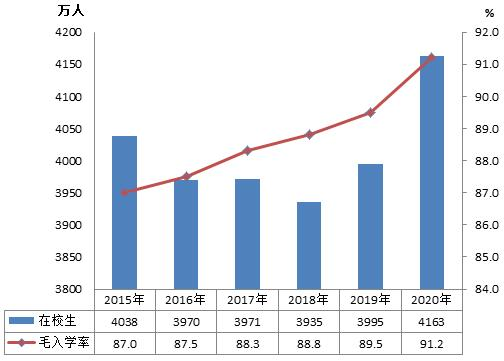图4 “十三五”时期高中阶段教育在校生和毛入学率