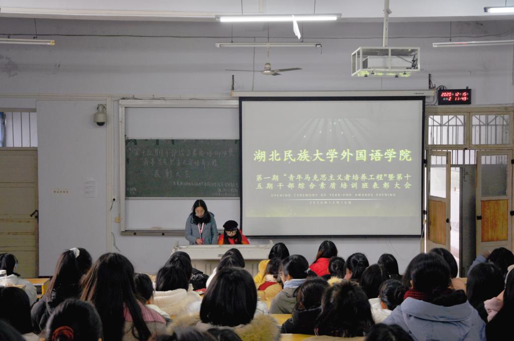时间:2020-12-16 编辑:学生科 点击:本网讯(通讯员 李梦然 /摄影 蔡莎莎)12月15日中午,我院于文汇楼6402教室成功开展第一期青年马克思主义者培养工程暨第十五期干部综合素质培训班表彰大会。出席此次表彰大会的嘉宾有外国语学院团总支书记陈小双,外国语学院团总支副书记李艳琴,外国语学院团总支副书记向俊逸。