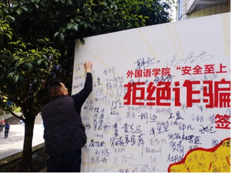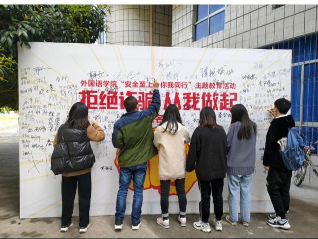 “拒绝诈骗,从我做起”系列活动是外国语学院落实学校“安全至上 你我同行”主题教育活动的子活动之一,学院还将开展生命安全教育、国家安全知识竞赛、传染病防控知识普及等活动防范校园安全风险,守住校园安全底线,切实维护全院学生安全和校园稳定。