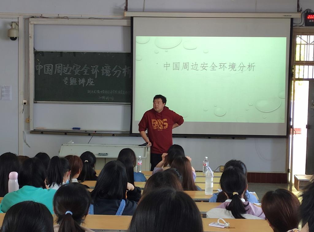 时间:2021-04-23 编辑:学生科 点击:本网讯(通讯员:胡进怡 摄影: 柴新宇 赵雪)为牢固树立学生们的国家安全观念,提高学生的国家安全意识,4月22日下午,我院于6402教室成功举办中国周边安全环境分析专题讲座,本次讲座主讲人为我院讲师李靖,李老师硕士毕业于中国人民大学,目前于北京大学就读博士,其主要研究方向为美国与东亚,城市外交和对外政策研究。出席本次讲座的嘉宾有学生科科长粟登平老师,学院团总支书记陈小双老师,学生科辅导员田甜老师。